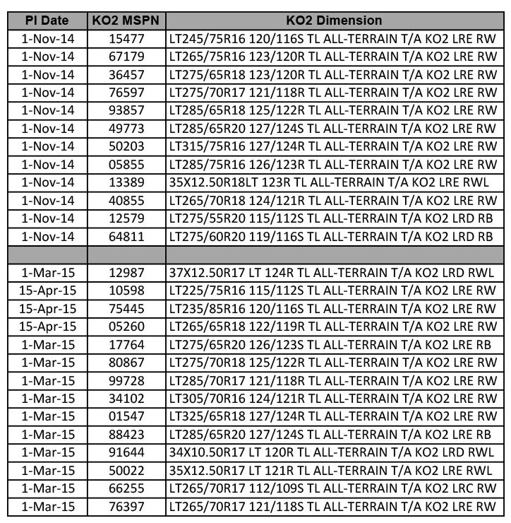 Bfg At Ko2 Size Chart Tires Weight For Expo Trailer