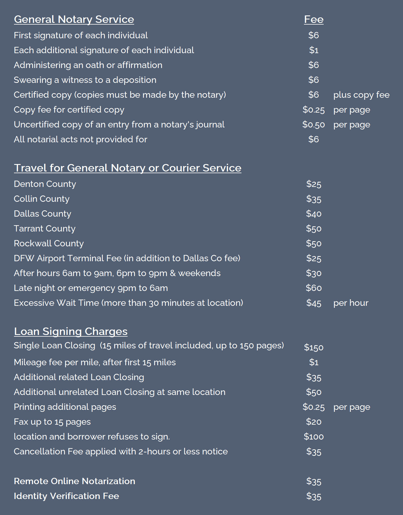 Fees DFW Notary Solutions Dallas, TX